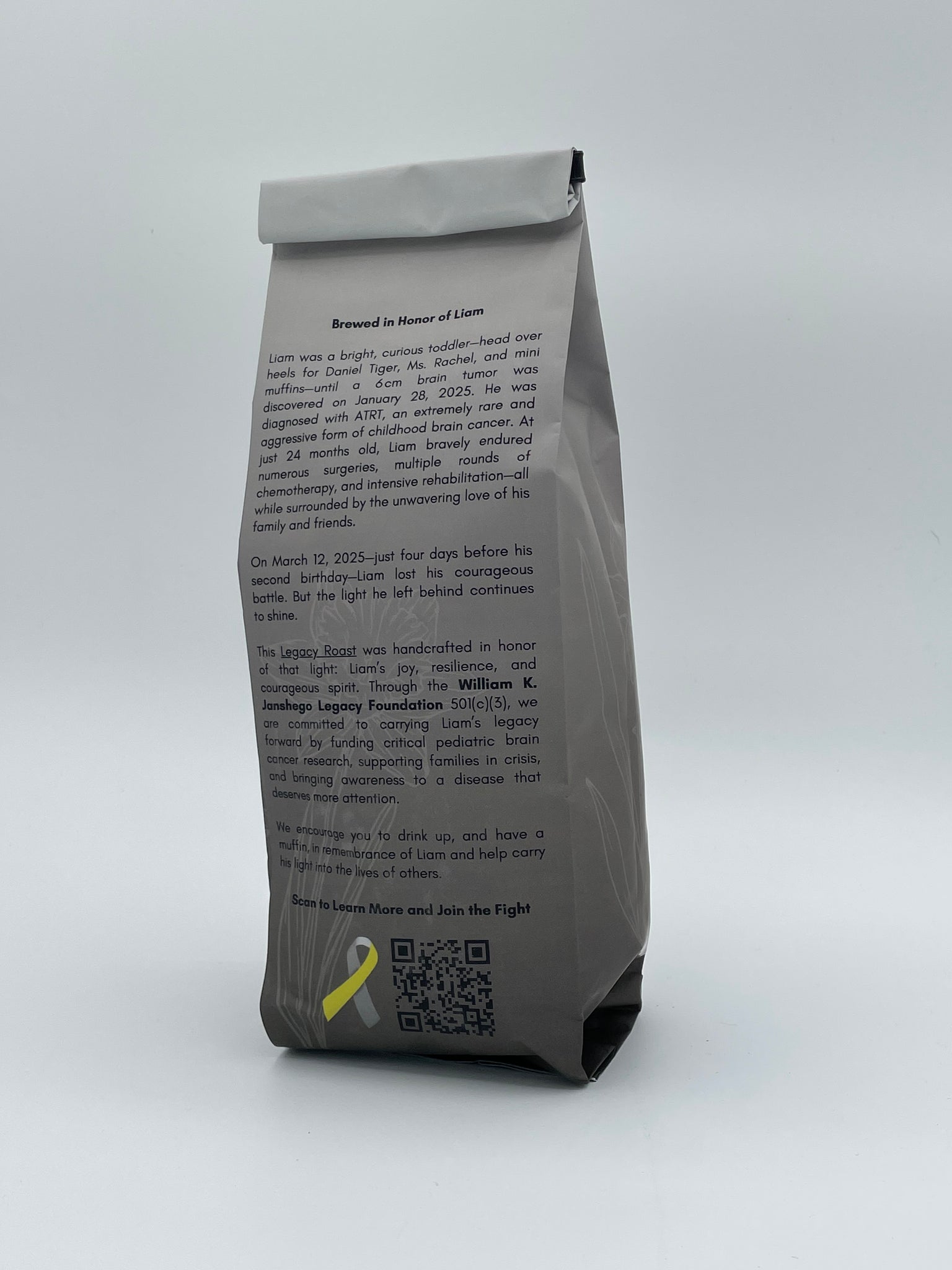 Burlington Coffee Co is partnering with the William K. Janshego Legacy Foundation 501(c)(3), to offer a beautiful (seasonally-rotating) roast to both commemorate a rad little dude, Liam, who lost his battle with brain cancer in 2025, and offer funding for brain cancer research as well as relief for families of future cancer patients. It takes a lot to fight this disease, and The Janshego family have made it their mission to relieve those going through the struggle in whatever way they can.